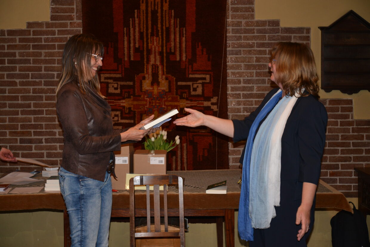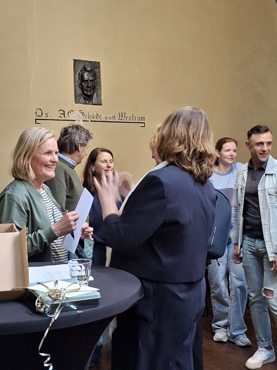 Na afloop van de quiz onthulde Anton het allereerste exemplaar. De trilogie is nu compleet en ziet er dankzij Mariët Visser ook nog eens geweldig uit. Het eerste exemplaar van Anderland gaf ik aan Inge de Bie, de inspirerende schrijfcoach en lieve vriendin, met wie ik al sinds 2009 op schrijfretraite ga. Binnenkort zal ik een berichtje wagen aan hoeveel ik voor mijn schrijversschap heb gehad aan die bijeenkomsten, eerst in Frankrijk, tegenwoordig in Drenthe.
